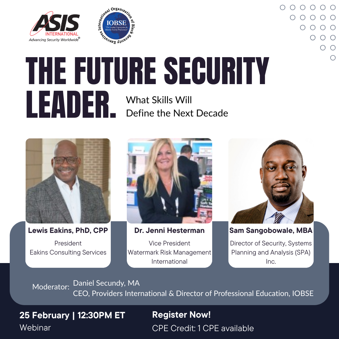 Conducted in partnership with ASIS and IOBSE, this forward-looking exchange examines analytical literacy, cross-domain fluency, ethical judgment, and strategic communication. Panelists with differing perspectives will articulate what the next generation of security leaders must master.